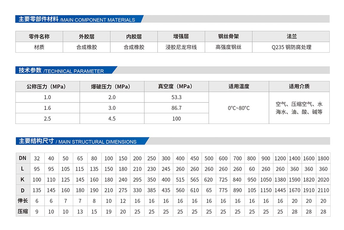 由織物增強(qiáng)的橡膠件,一般由內(nèi)膠層、織物增強(qiáng)層、鋼絲圈、外膠層經(jīng)硫化成橡膠件后與松套金屬法蘭組成,用于管道隔振降噪、補(bǔ)償位移的接頭??裳a(bǔ)償軸向位移、徑向位移和角向位移。具有耐壓高、彈性好、位移量大、平衡管道偏差、吸收振動(dòng)、降低噪音效果好。