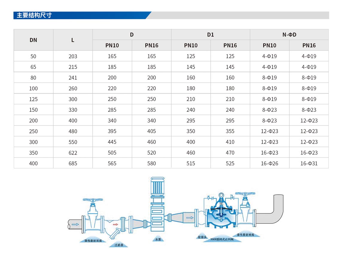 具有開啟和關閉速度調控的逆止閥,于啟動或停止抽水機運轉時,可配合現(xiàn)場調節(jié)至開啟或關閉速度。可用于高層建筑,減少水錘及水聲現(xiàn)象產生,以達安靜關閉之效果。 公稱壓力∶PNI0、PNI6、PN25 隔膜式∶DN50~DN500