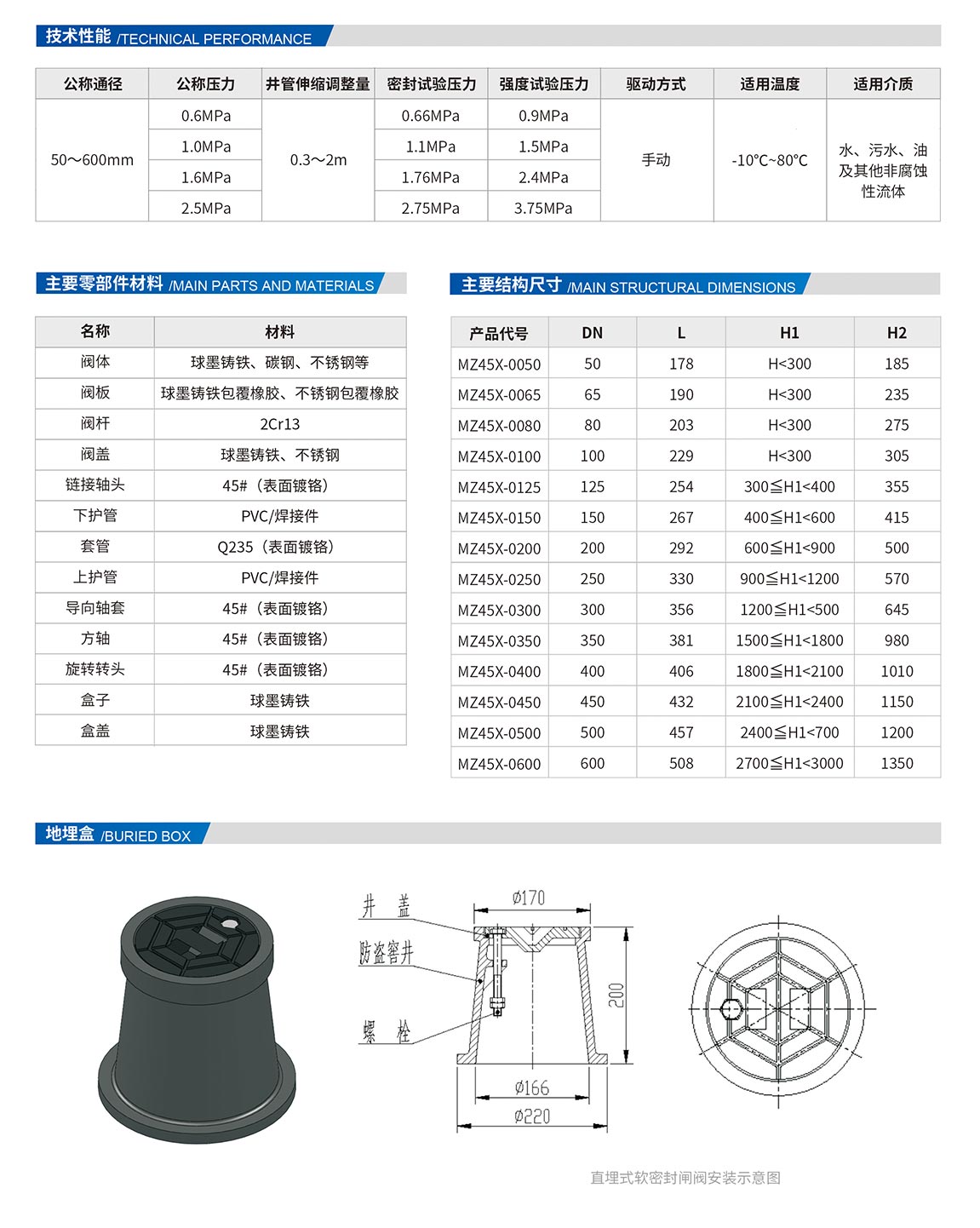 直埋式軟密封閘閥由閥門、地埋裝置(包括伸縮桿、伸縮護(hù)套、地埋盒)等部分組成。其閥門部分除了具有軟密封閘閥的所有特點(diǎn)之外,還具備先進(jìn)的烤漆層防腐技術(shù),閥體不會(huì)生銹,確保三十年免維護(hù)。由于軟密封閘閥使用壽命長,性能穩(wěn)定,在軟密封閘閥基礎(chǔ)上添加了一個(gè)伸縮桿、伸縮護(hù)套,并配以地埋盒,形成直埋式軟密封閘閥,特點(diǎn)如下: