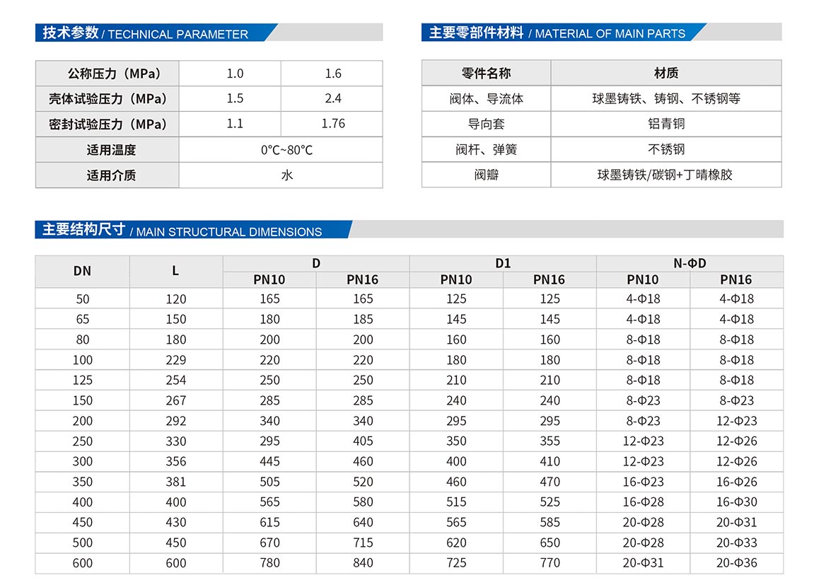 HC42X靜音式止回閥由閥體、閥座、導(dǎo)流體、閥瓣、軸瓦及彈簧等零件組成。內(nèi)部流道采用流線型設(shè)計(jì),壓力損失小,閥瓣啟閉行程很短,停泵時(shí)可快速關(guān)閉,防止巨大的水錘聲,形成靜音效果。該閥主要用于給水、排水、消防、暖通系統(tǒng),可安裝于水泵出口處,能夠防止介質(zhì)倒流,達(dá)到保護(hù)水泵及管道目的。