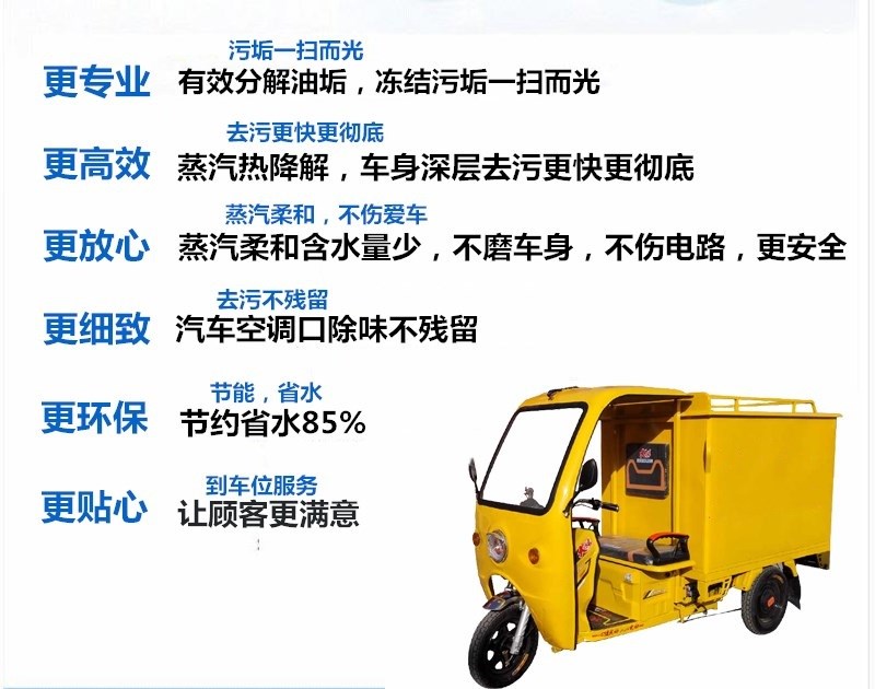 采用蒸汽高壓技術洗車,引進歐美先進技術,擁有清水、泡沫、吸塵、風干、鍍膜、除臭、凈手、玻璃水添加、防凍等齊全的功能,省水省電、節能環保、機型美觀、性能穩定,節省費用,方便實用。