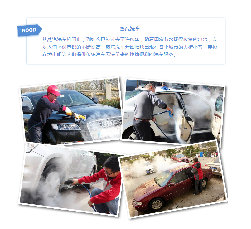 而且如今的蒸汽洗車機也不在單單停留在洗車這一種用途上。清洗油田設備上的油污、清洗公路隧道路欄、清洗大型燈飾、清洗毛絨紡織品等等都有實例可查的,大功率的蒸汽洗車機早已廣泛應用于交通、工業、生活清洗領域,并取得顯著的成效。