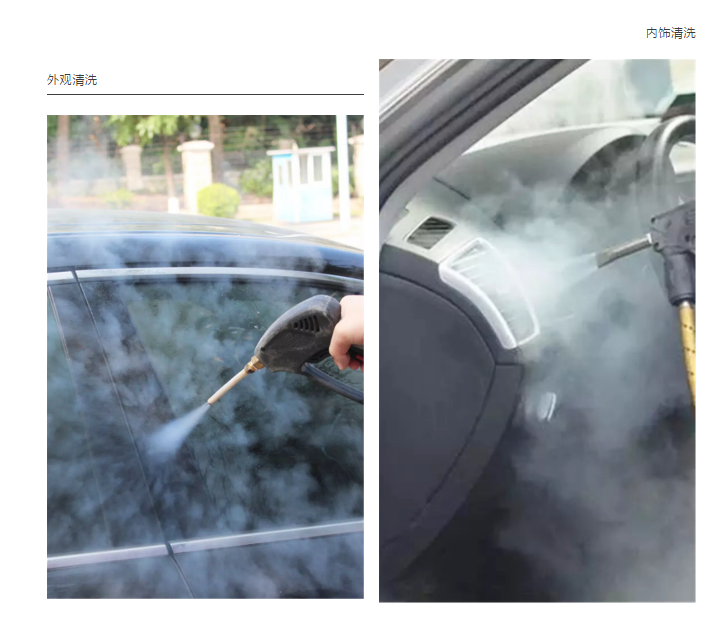 汽車內、車門、發動機的深處以及內部的布料及中控臺上的污漬通常都已風干,直接擦洗很難清理,高壓的蒸汽噴到污漬表明時就會瞬間冷凝成水,起到潤濕和軟化污漬的效果,使污漬開始軟化分解汽車內飾表面,在后續高壓蒸汽的沖洗下,直接將污垢一掃而光,并且消毒。