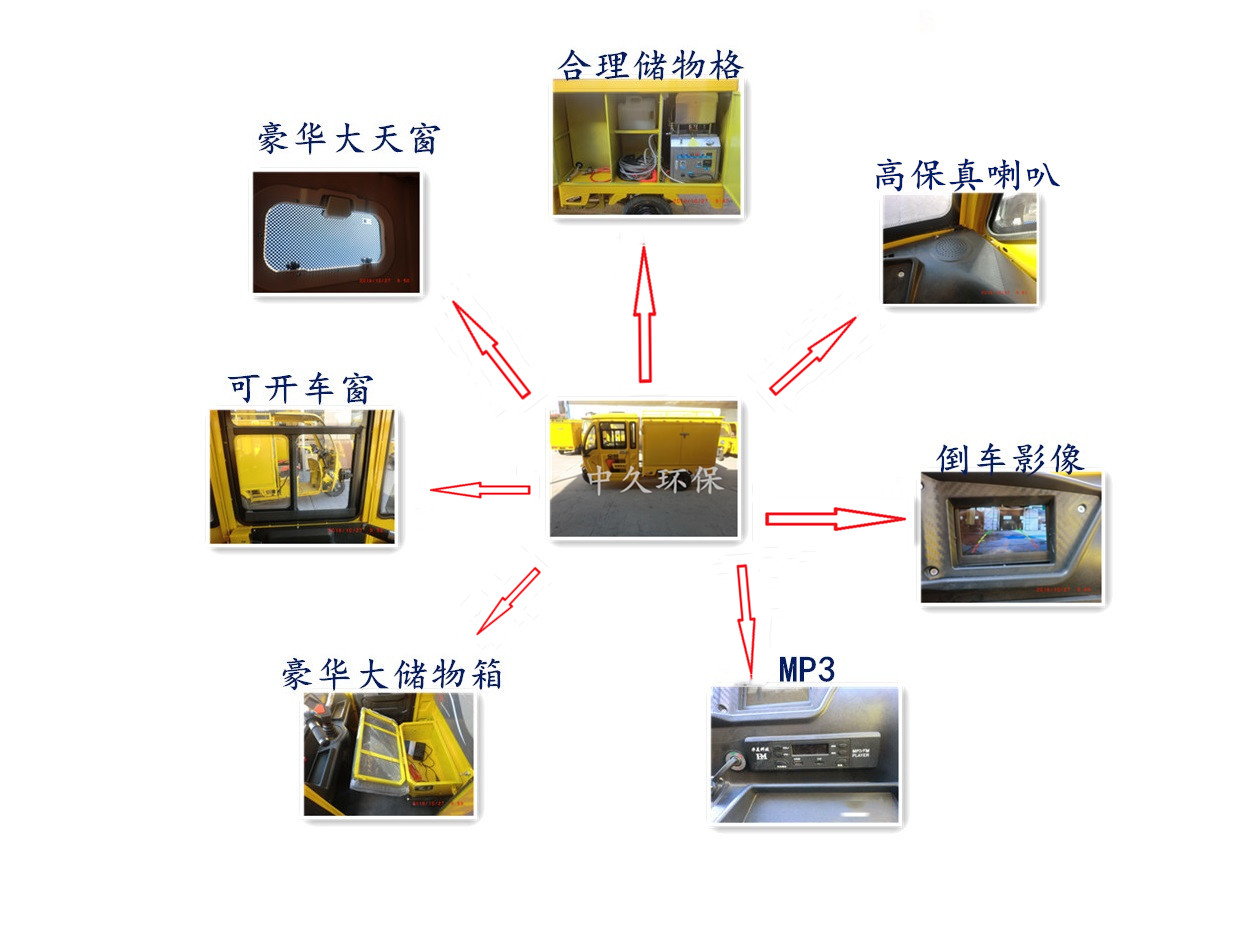1.中久環(huán)保三輪車清洗設(shè)備采用850瓦加力馬達(dá),適用于所有地形,無攀爬壓力。
